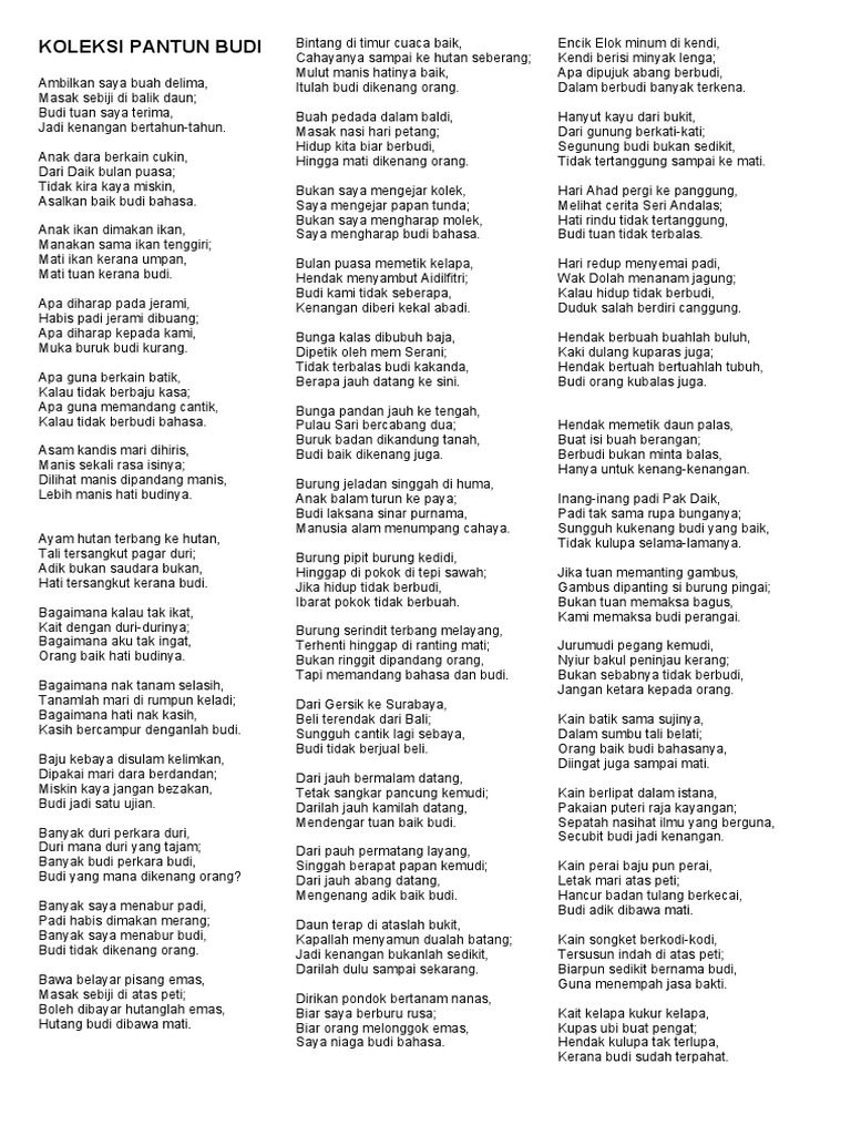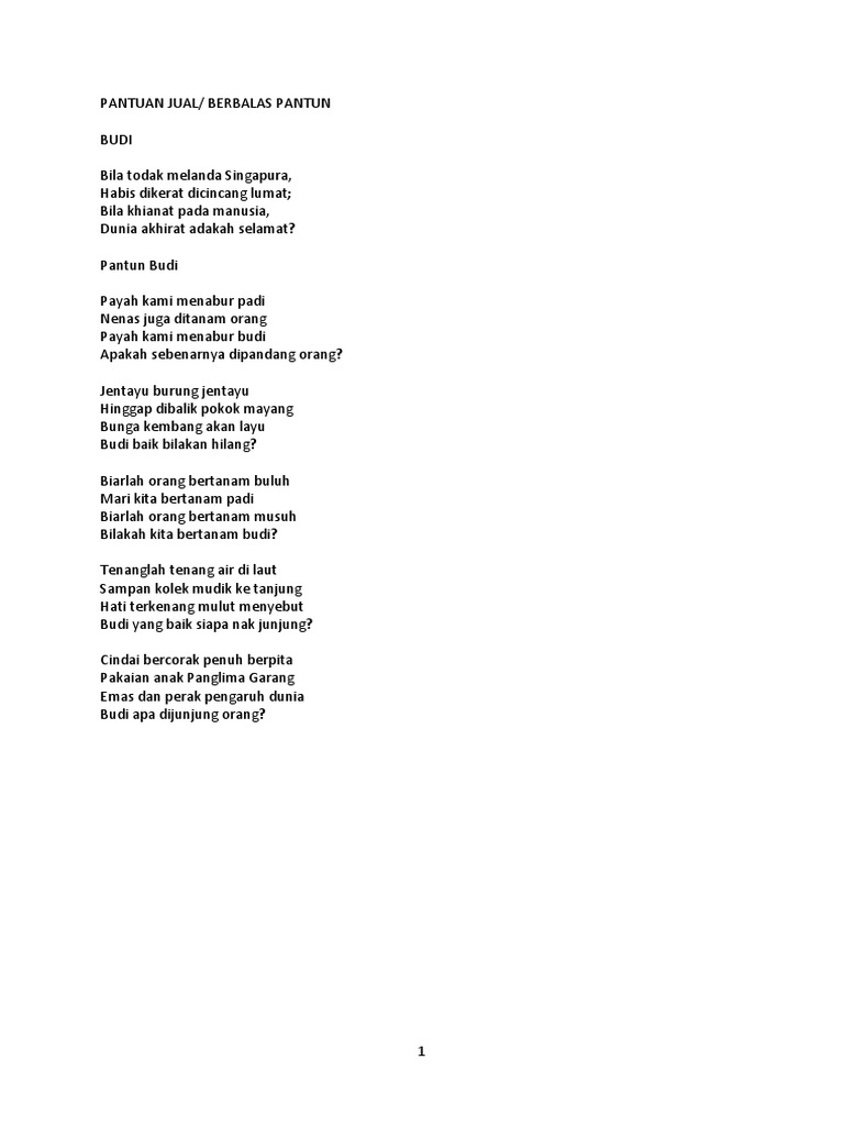 Bisa disampaikan ke sanak saudara agar hatinya terbuka. Pantun juga tidak mempunyai nama penulis maupun nama pengarang seperti puisi pada umumnya. Buah budi bedara mengkal masak sebiji di pinggir pantai hilang budi bicara akal buah apa yang tidak bertangkai? Sastra, yang merupakan salah satu cabang seni juga mencakup pantun. Pantun adalah puisi lama yang sudah sangat salah satu contoh yang sering kita lihat adalah pantun ketika dua orang jawara bermain lenong. Darimana hendak kemana dari udik hendak ke kota kalau boleh abang bertanya adik yang cantik siapa namanya. Pantun adalah sebuah karya yang tidak hanya mempunyai rima dan irama yang indah, namun juga mempunyai makna yang sangat penting. Pantun tidak hanya ada yang lucu saja. Bisa juga yang terbayang adalah kejelian saat merangkai contoh pantun dan keseruan ketika berbalas pantun. Inilah pantun pantun pengantin dibuat untuk yang lagi bahagia disingkat p3 bukan karena menteri agama dari p3 sederhana semoga mengena dihimpun dari yang berserak ditata agar pesta tambah semarak nasehat singkat mungkin kurang memikat tapi insya allah bermanfaat amin. Kumpulan contoh pantun jenaka, pantun nasehat, teka teki, agama, pendidikan, cinta, romantis, persahabatan, perpisahan, ulang tahun, anak dll. Contoh surat pengantaradalah surat yang dibuat untuk tujuan memberitahu kepada pihak yang kop surat pada semua surat resmi pencantuman kop surat wajib ada didalamnya, fungsi kop surat tips yang bisa anda pakai untuk membuat surat pengantar adalah jangan sampai melupakan kop surat. Pantun budi adalah pantun yang berisi tentang kesopanan, sikap dan perilaku.