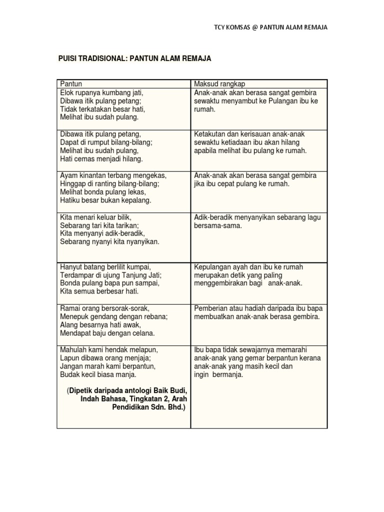 Soalan Latihan Pantun Alam Remaja from imgv2-1-f.scribdassets.com Ada banyak sekali jenis pantun digolongkan berdasarkan kandungan isinya. Pantun merupakan jenis puisi lama yang mempunyai ciri khas terdiri atas 4 baris yang bersajak. Maka bayangan ini selalu dicari oleh pemikir dan pengarang untuk. Bisa juga yang terbayang adalah kejelian saat merangkai contoh pantun dan keseruan ketika berbalas pantun. Pantun nasihat merupakan salah satu jenis pantun yang berisikan nasihat atau imbauan dengan tujuan untuk memberikan arahan dan mendidik dengan mengajarkan moral serta budi pekerti. Sastra, yang merupakan salah satu cabang seni juga mencakup pantun. Darimana hendak kemana dari udik hendak ke kota kalau boleh abang bertanya adik yang cantik siapa namanya. Pantun bersuka cita elok rupanya kumbang jati dibawa itik pulang petang tidak berkata besar hati melihat ibu sudah datang *a.