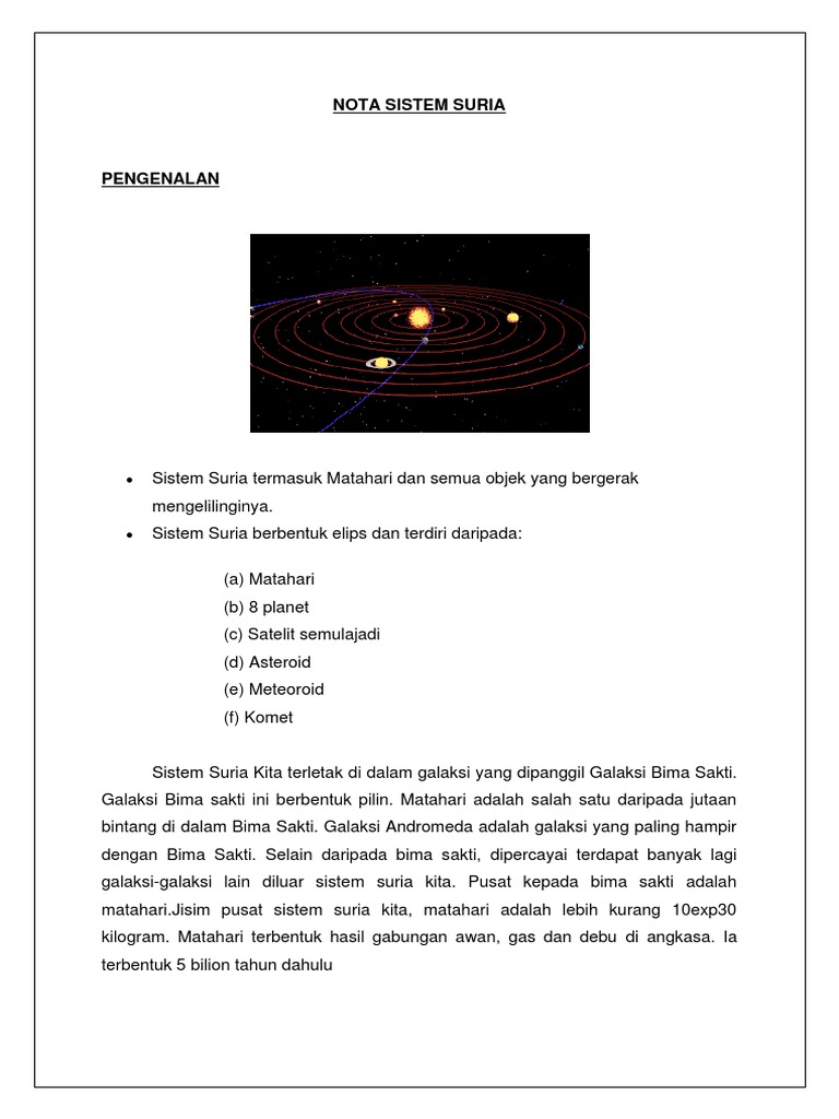 Sistem suria kita terdiri daripada: Matahari adalah ahli sistem suria yang paling besar. (a)matahari sebagai pusat sistem suria; Koperatif pengetahuan sedia ada : Semua ahli sistem suria beredar mengelilingi matahari dalam arah yang sama namun pada kelajuan yang berbeza. Bimi ialah planet yang ketiga dari. Ya, sudah sekitar 4.5 bilion tahun, tetapi juga dianggarkan bahawa alam semesta adalah ahli astrologi percaya bahawa kebanyakan komet tempoh pendek berasal dari sabuk kuiper sementara kebanyakan komet jangka panjang. Planet ialah nama yang diberikan kepada jasad besar berbentuk sfera yang beredar mengelilingi matahari.terdapat sembilan planet dalam sistem suria. Sistem suria terdiri daripada matahari dan objek astronominya yang terikat oleh gravitinya ke dalam orbit sekelilingnya. Sistem suria kita sebenarnya masih baru kepada alam semesta. Matahari adalah sebiji bintang yang terletak paling hampir dengan bumi. Planet keenam dari matahari dan merupakan planet kedua terbesar dalam sistem suria. Matahari mengeluarkan haba, cahaya dan tenaga.
